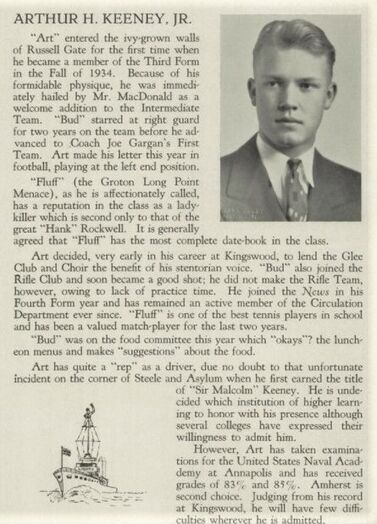 Arthur was one of 29 graduates from Kingswood School, West Hartford, in 1938. The accident referred to in his yearbook (below) was reported by the Hartford Courant on September 29, 1937. “An automobile operated by Arthur H. Keeney, Jr., 17, of 88 Church Street, Manchester, was badly damaged Tuesday at 6 p.m., when it skidded on Steele Road and smashed into a tree. Keeney was not injured. Sergeant Daniel Donaghue, who investigated, made no arrest.”