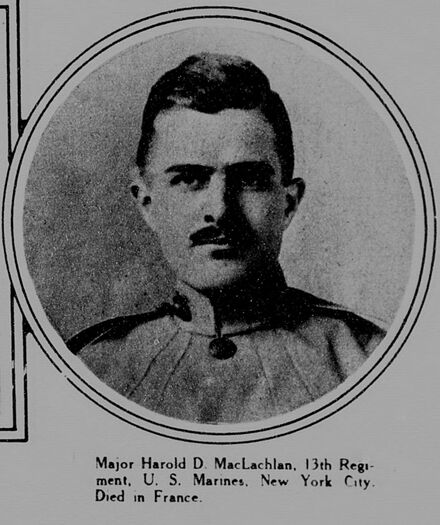 Major Harold D. McLachlan, U.S.M.C., died in a hospital in France on September 27 [1918], according to word received by his uncle, Dr. A.C. McLachlan, principal of the Jamaica (N.Y.) Training School for Teachers. Major McLachlan formerly lived in Binghamton, N.Y.The above notice was repeated in the New York Times with information added regarding a marriage: