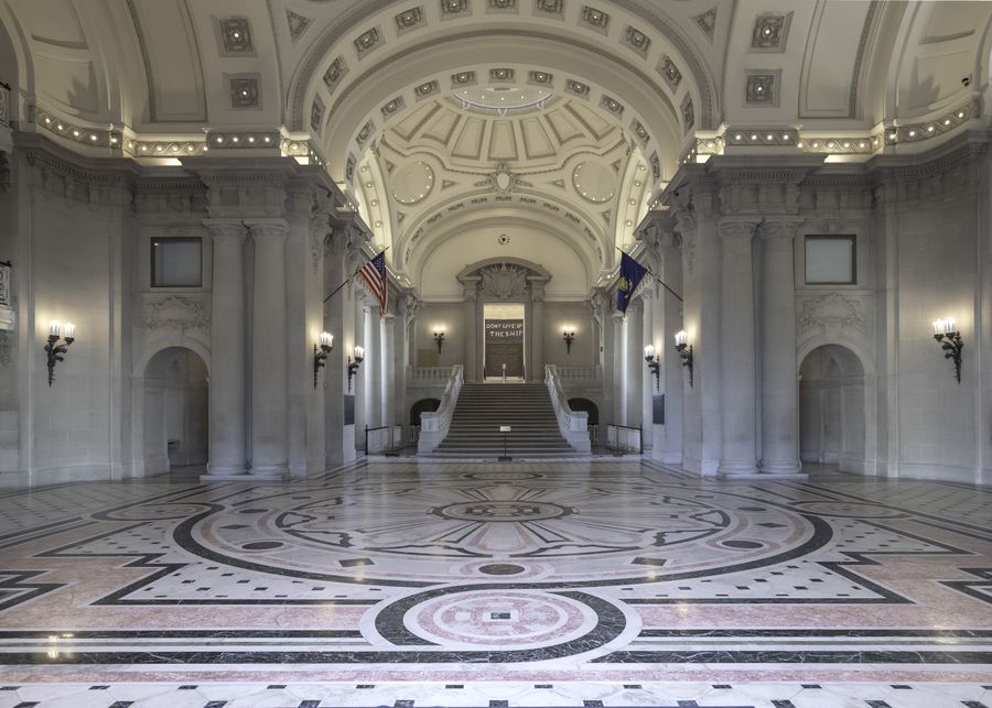 Imagine being one of the first to see Bancroft Hall upon its completion in 1906. Gazing up at the dome you stand in awe of Ernest Flagg's design. From the Rotunda you descend to Recreation Hall where ornate chandeliers command your attention. Next you climb the stairs to Memorial Hall, pause to remove your hat then enter. Its limestone is pristine, its floor brilliant, and the smell of fresh paint permeates the air. It is a sacred space, a reverent space. Those who visit the Academy today are fortunate to have a similar experience. After one year of construction, Bancroft Hall's Center Section has been restored to its initial grandeur. The section, including Memorial Hall, Smoke Hall, and the Rotunda, was re-opened on 15 May 2003 and is stunning.