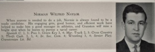 Norman Wilfrid Naylor (SN 0-165841) was born on 23 July 1920 in Providence, Rhode Island. He was the son of Wilfred Naylor (1886-1964) and Ellen Partington (1894-1988), who had immigrated to the United States from England in 1914. His parents both worked in a textile mill in Providence. In 1930, when he was ten years old, his mother took him to England, likely to visit his parents’ families. He graduated from Cranston High School in 1938. His yearbook stated that “When anyone is needed to do a job, Normie is always found to be a ready candidate.” [Note: Some sources spell Norman’s middle name Wilfred.]