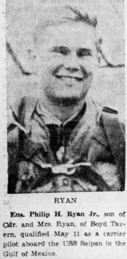 We are sorry to have to announce the death of PHILIP HENRY RYAN, JR., on 3 August at Corpus Christi, Texas. Phil was a flight student and was killed when his parachute failed to open after the collision of two training planes. He and H. F. Snyder both jumped and Snyder suffered a broken leg. The two occupants of the other plane were also killed. Phil, Sr., is in the Class of 1923.