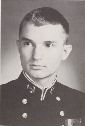 Bill entered the Academy immediately following his graduation from high school in Hughesville, Pennsylvania. Being a Marine junior he was not particularly surprised at the rigors of the transition from the civilian to the military way of life. He made a determined effort during his four years to keep abreast of the social life, maintain the "good life", and keep his realistic perspective — even though his policy at times conflicted with that of the Executive Department. Bill's personal interests ranged from quick cars and the outdoors to the opposite sex. His abilities and common sense will make him an outstanding officer in the years to come, and his friendly personality will make him a great man with whom to serve.