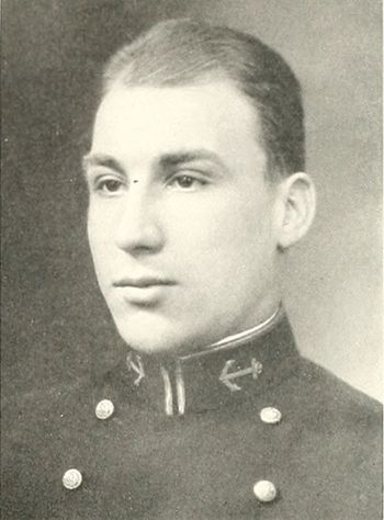 A mean swimmer and debater was Bill in high school. Consequently when he blew into the Navy from the "Windy City" he became a sea-lawyer and as such the Academic Departments knew him. He will stick to his point unless proven wrong—which his roommate will vouch was seldom—and he will stick to his friends always. He's tough as nails but has a weak heart and a weak ankle; not the sort of guy to hit on a dark night, but rather the sort to have as a buddy; tremendously good-hearted, meaning he has many friends; generous to his last skag if he is not in training, or to his last cent if not broke, or to his only "skivvy" if it isn't in the laundry—that's Bill. He is a game lad and easy to get along with, for he likes anything you do. His main interests have been hops, femmes, bridge, tennis, golf, shooting the bull, reading, leave, and the Navy (when on leave).