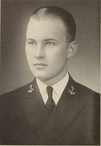 PRESENTING—the better half. Well built, blond, 2nd platoon. A Missouri man, he does have to be shown. He is ruled by his head and mistrusts his heart. He demands odds in his favor. He is sufficiently sophisticated to appreciate certain little formalities as a prelude to pleasure, yet he has a boyish enthusiasm which is the symbol of his personality and his "ace in the hole." Girls, as a rule, cause him to lose his customary "savoir faire," but he never lacks for their mail (the femmes will know what this means.) He is proficient enough with slip-stick, pistol, sextant, and his line to write his own answers to life.