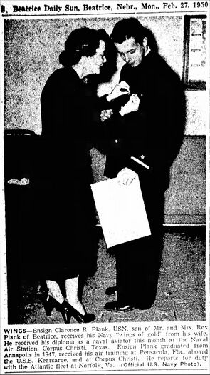 An article in the Beatrice Daily Sun on October 11, 1948 mentioned that Clarence had recently returned to visit family after deploying to the Mediterranean Sea as Training Officer of USS Kearsarge (CV-33); he was leaving shortly for duty at NAS Pensacola.