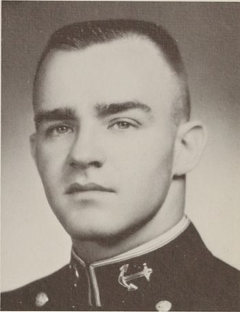 When anyone mentions the city of Chicago, Doug's name always comes to mind. The Academy was very lucky to have attracted the Windy City's number one fan to the east coast, for he added much to his class and his school. Intensely interested in anything and everything, Doug could usually be found attending a meeting of some sort, be it the Russian or Foreign Relations Club or the Naval Academy Christian Association. His afternoons were usually spent in the wrestling loft, and on the weekends, it was no strange sight to see him running the rocks along the seawall or playing a pick-up game of football on Thompson field.