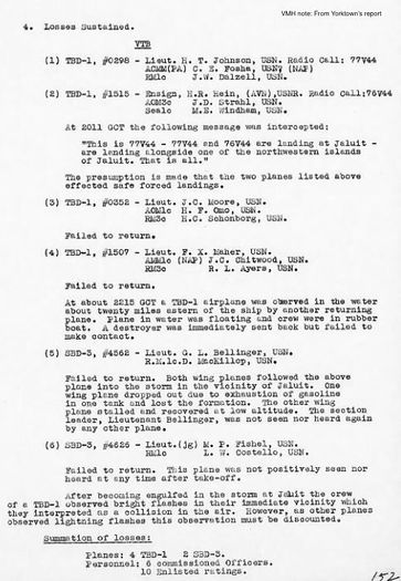 George Bellinger '32, Francis Maher, Jr. '35, and Jack Moore '36 were all flying from Yorktown and were all lost that day. George Bellinger's plane simply "failed to return;" he had last been seen in the vicinity of Jaluit as the leader of a bombing section. Jack Moore's plane also "failed to return;" no other information was given in the after-action report. Francis Maher may have been the pilot of the plane observed in the water approximately 20 miles astern of the carrier, presumably having crashed due to a lack of fuel. The crew were seen getting into rubber rafts, but "a destroyer was immediately sent back but failed to make contact."