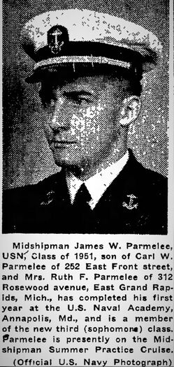 James attended East Grand Rapids high school, and as a sophomore, he won the American Legion scholarship to Morgan Park. He graduated from Morgan Park Military Academy in Chicago in 1942. He enlisted in the navy and was a midshipman in the V-12 program at the University of Michigan. He later spent a term at the navy’s fleet preparatory school. His appointment to the Naval Academy came from Rep. Bartell J. Jonkman.