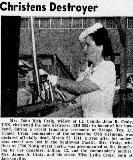USS John R. Craig (DD 885) was named for John; the ship was sponsored by his widow.