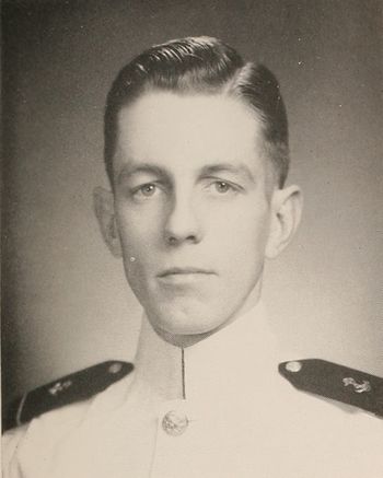 Tom made the long trip from the Rio Grande to the Severn by way of Texas University and the Fleet. Once here, he sailed into academics and athletics in true Texas style. Both fields were easily conquered, and he was equally proud of his stars and championship numerals. Tom's easy going attitude and level head kept him smiling despite the problems of his Hop Committee Chairmanship and made him well liked and admired by all. Already a licensed private pilot, he hopes to do some flying while in the service.